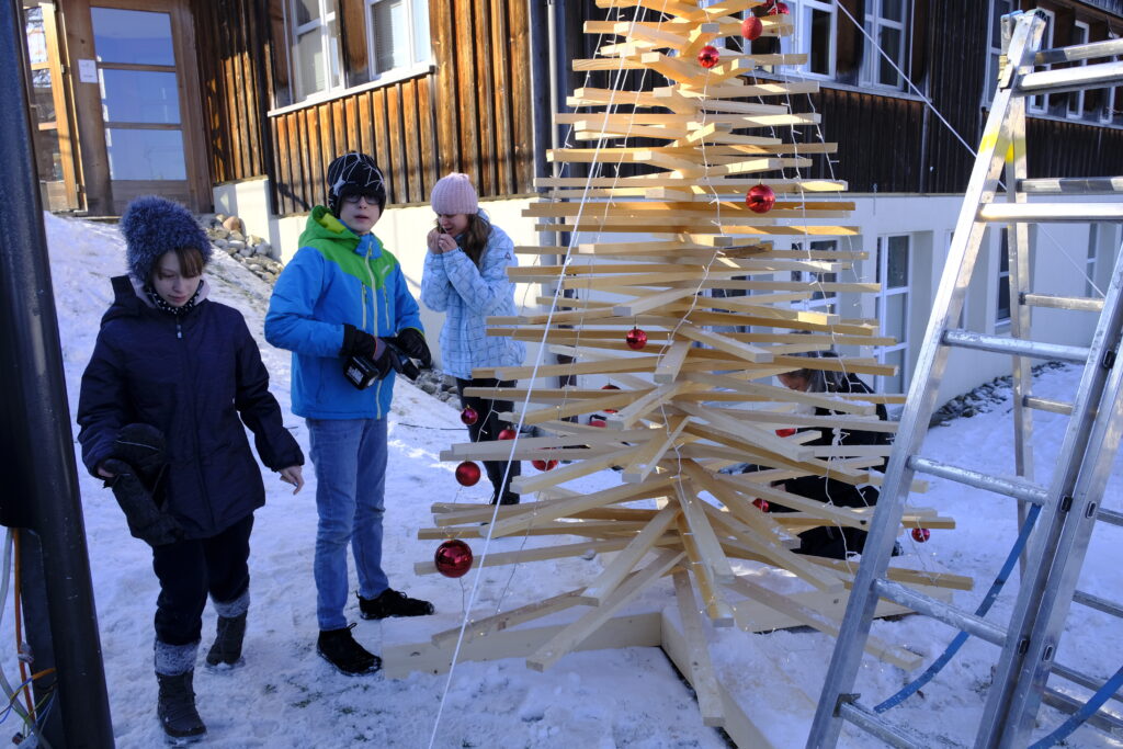 Dieses Jahr hat es geklappt. Die Oberstufenklasse hat unter der Leitung von Roman Möhr und Andrea Hartmann einen Weihnachtsbaum aus Holz hergestellt. Die Hauptaufgabe in der Produktion wurde von einem Oberstufenschüler im letzten Jahr übernommen. An der Dekoration haben sich etliche Schülerinnen und Schüler spontan beteiligt. Mit diesem Projekt ging ein kleiner Wunsch des Institutionsleiters in Erfüllung. Er bedankt sich herzlich bei allen, die sich an diesem Werkprojekt beteiligt haben. Möge dieser leuchtende Baum, die Vorfreude auf Weihnachten wecken.