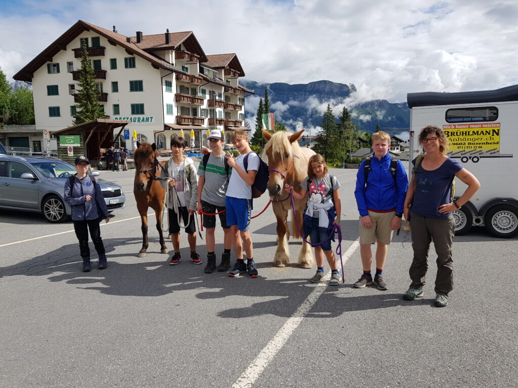 Unsere beiden Therapiepferde Molly und Arion verbringen ihre Sommerferien jeweils auf der Alp in den Flumserbergen. Schülerinnen und Schüler, welche die Pferdegestützte Intervention besuchen, durften Nicole Schmid, Fachfrau Pferdegestützte Intervention auf die Alp begleiten. Zuerst ging es mit dem Auto auf die Flumserberge. Von dort wanderten sie eine Stunde auf die Prodalp. Die zwei Pferde schlossen rasch Bekanntschaft mit ihren Artgenossen.