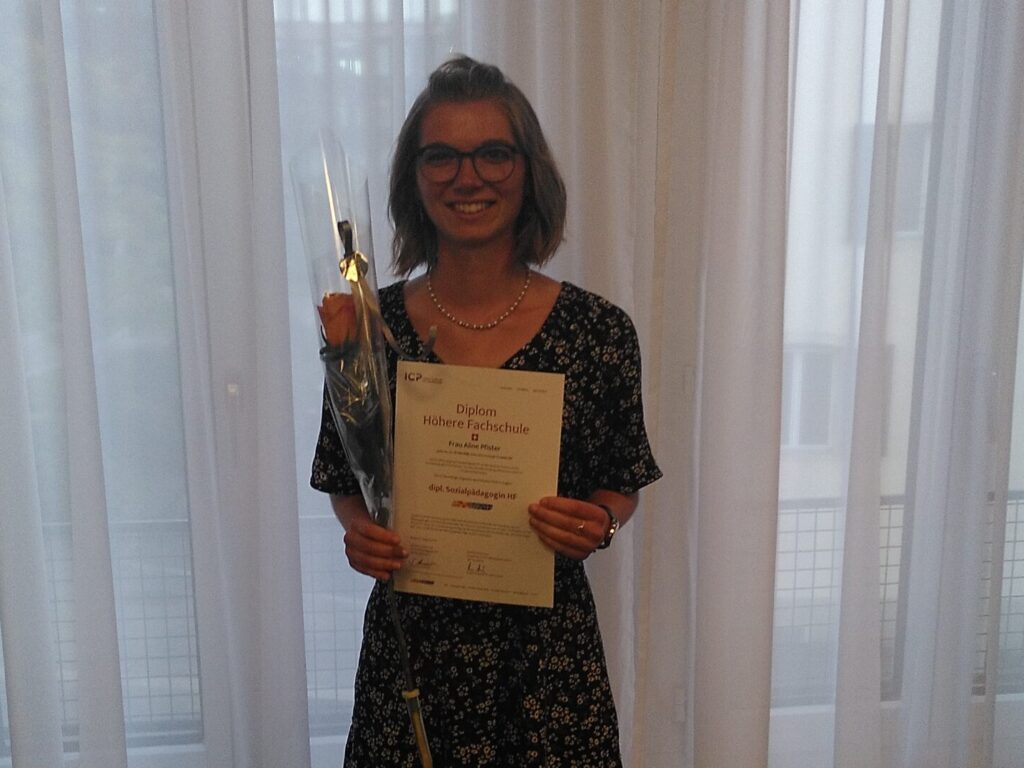 Ende August durfte Aline Pfister ihr Diplom zur Soialpädagogin HF entgegen nehmen. Wir gratulieren Aline herzlich zum erfolgreichen Abschluss der vierjährigen, berufsbegleitenden Ausbildung an der Höheren Fachschule für Sozialpädagogik ICP. Wir freuen uns, sie als ausgebildete Fachfrau weiterbeschäftigen zu können.
