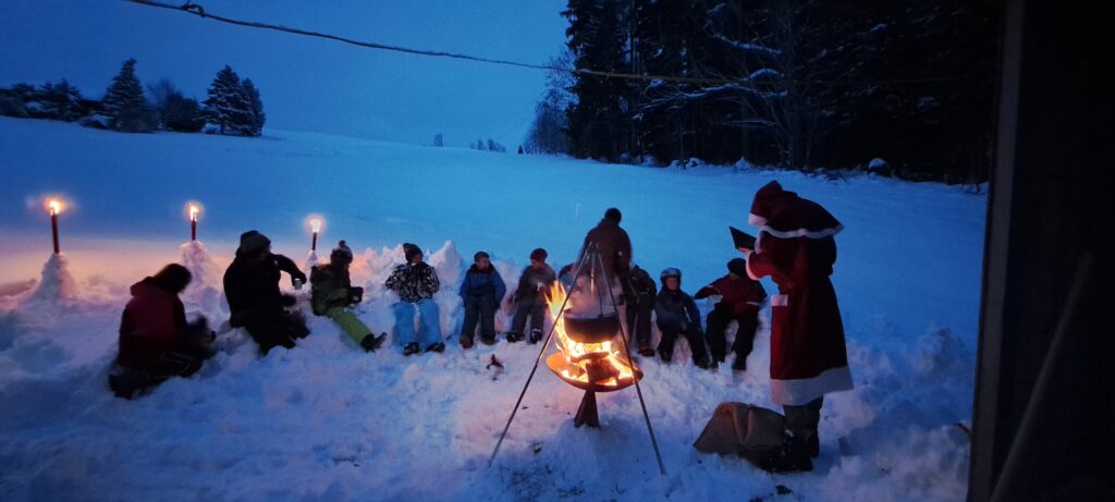 Am 6. Dezember stampften die Schülerinnen und Schüler durch den tiefen Schnee. Sie suchten den Samichlaus. Zuerst fanden sie ein Lagerfeuer, brennende Fackeln wiesen ihnen den Weg. Als sie sich mit einem warmen Punch wärmten, kam aus dem Wald der Samichlaus daher. Alle hörten gespannt was der Chlaus Gutes zu berichten wusste. Die Kinder wunderten sich, dass der Chlaus nur positives zu erzählen wusste. Er meinte es sei wichtig, ihnen auch mal nur das zu sagen was sie gut machen. Darüber freuten sie sich. Jede und jeder bekam das ersehnte Säckli mit vielen Leckereien drin. So wanderten alle im Schneegestöber zufrieden zurück zum Sonderschulinternat Hemberg.